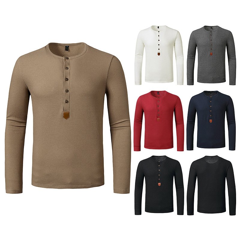 New hollow men's autumn and winter long-sleeved bottoming waffle Henry collar T-shirt 6013
